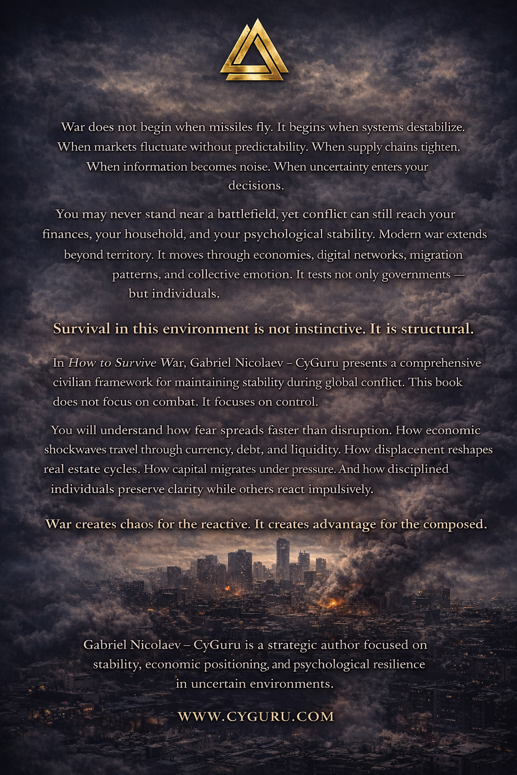 In How to Survive War, Gabriel Nicolaev – CyGuru presents a comprehensive civilian doctrine for modern instability. Drawing from structural analysis, economic pattern recognition, and psychological resilience frameworks, this work examines how global conflict reshapes markets, influences behavior, and exposes vulnerabilities in unprepared systems.