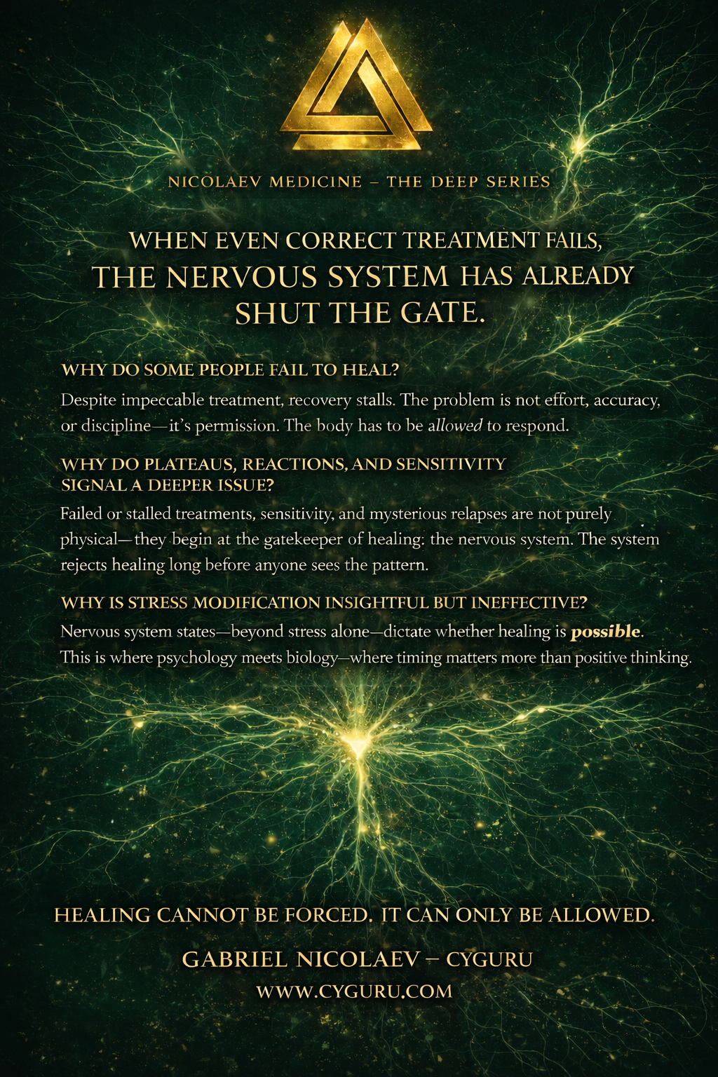 Drawing from the Nicolaev Medicine framework — integrating nervous system science, emotional regulation, energy coherence, and internal safety — this book reframes treatment failure without blaming medicine, patients, or practitioners.